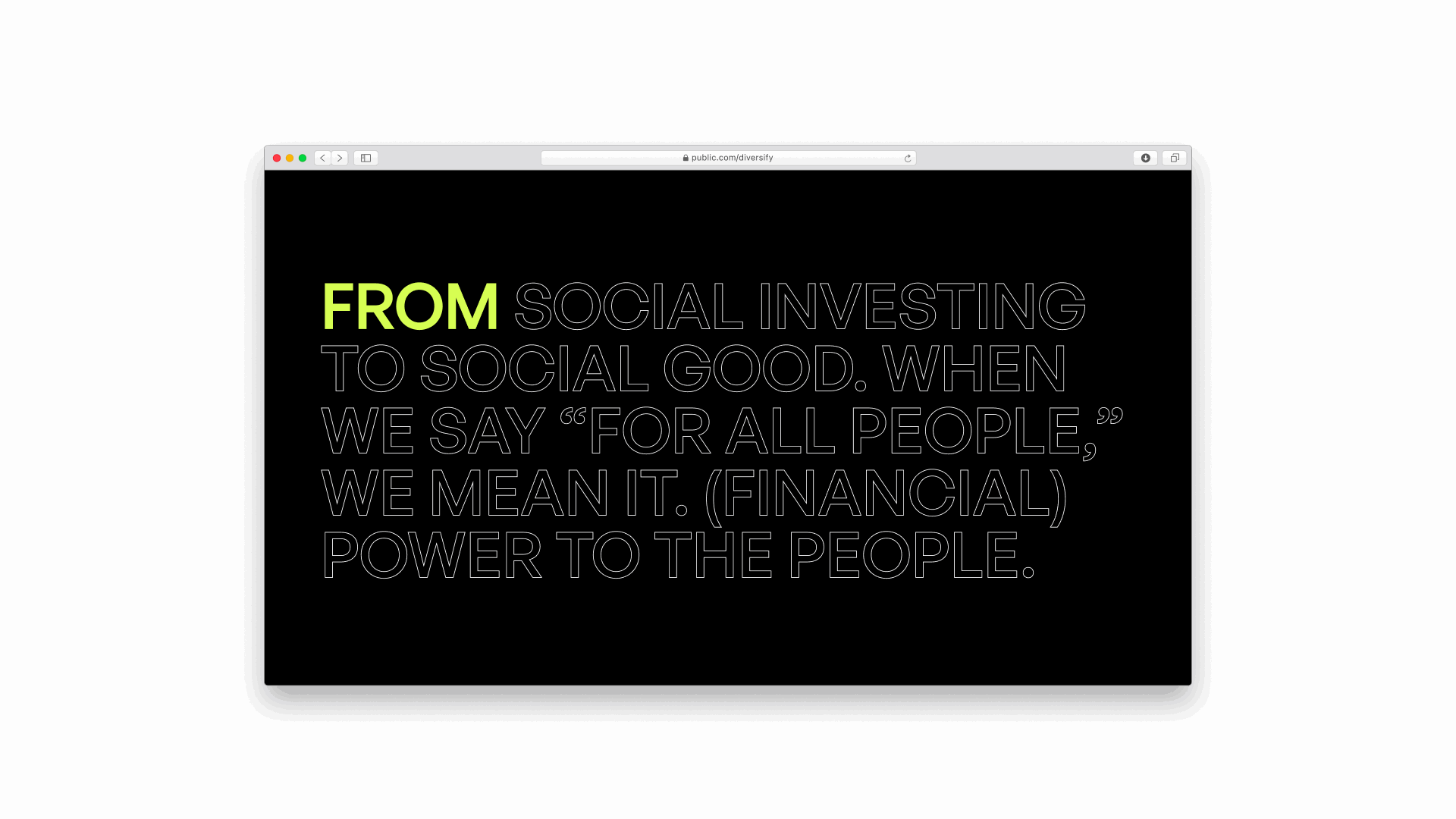 Welcome to my case study for Diversify. Our VP of Brand and Lead Brand Designer at Public gave me this project. Diversify was a concept developed to house all of our social good initiatives. The goal was to create something hip that would resonate with the Public.com core demographic at the time (new/young Investors).